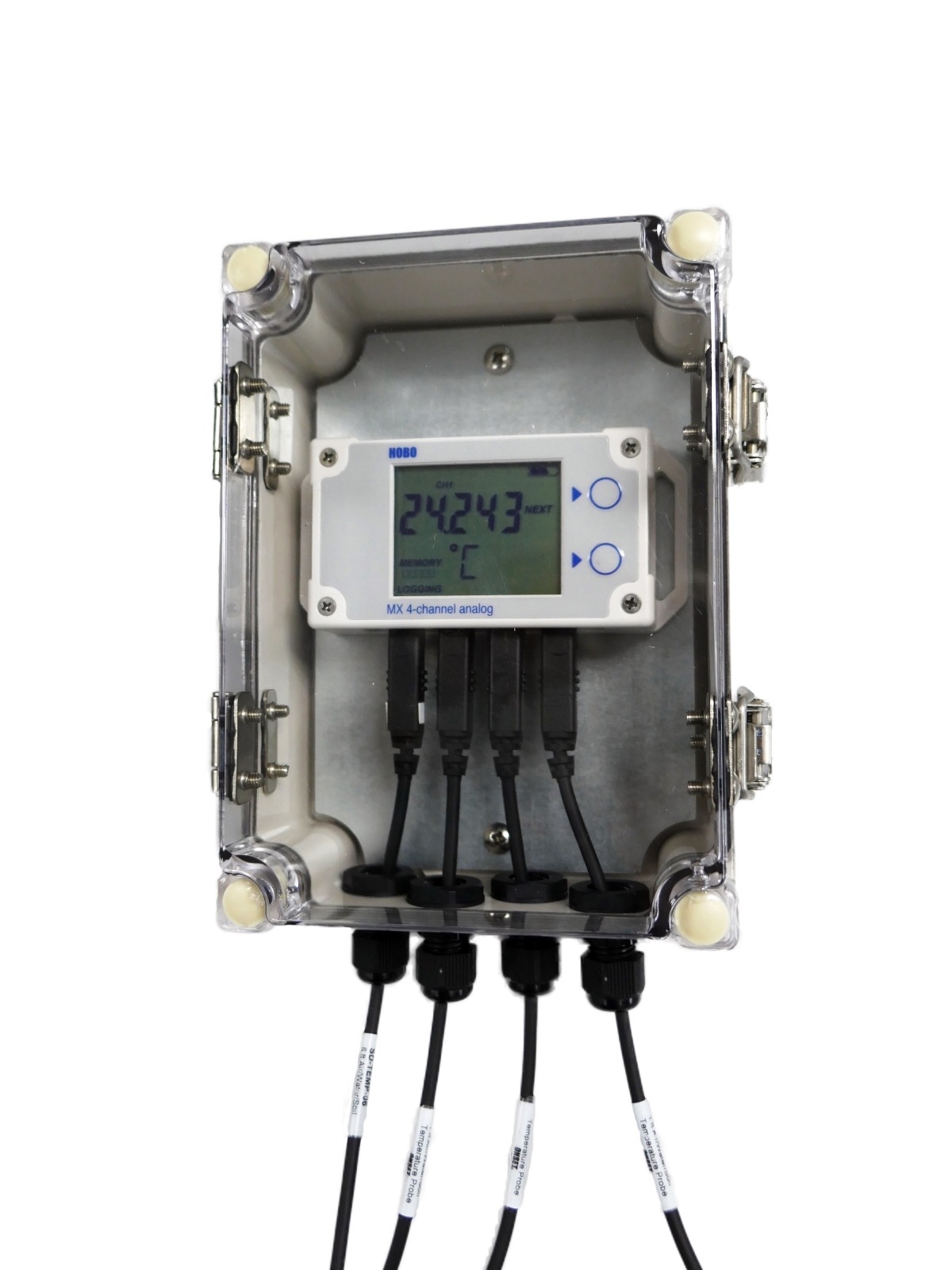 This Enclosure is suitable for HOBO Data Loggers with External Sensors and has an IP66 Rating (with all glands sealed and box mounted vertically) and a Transparent cover to see the data logger display.