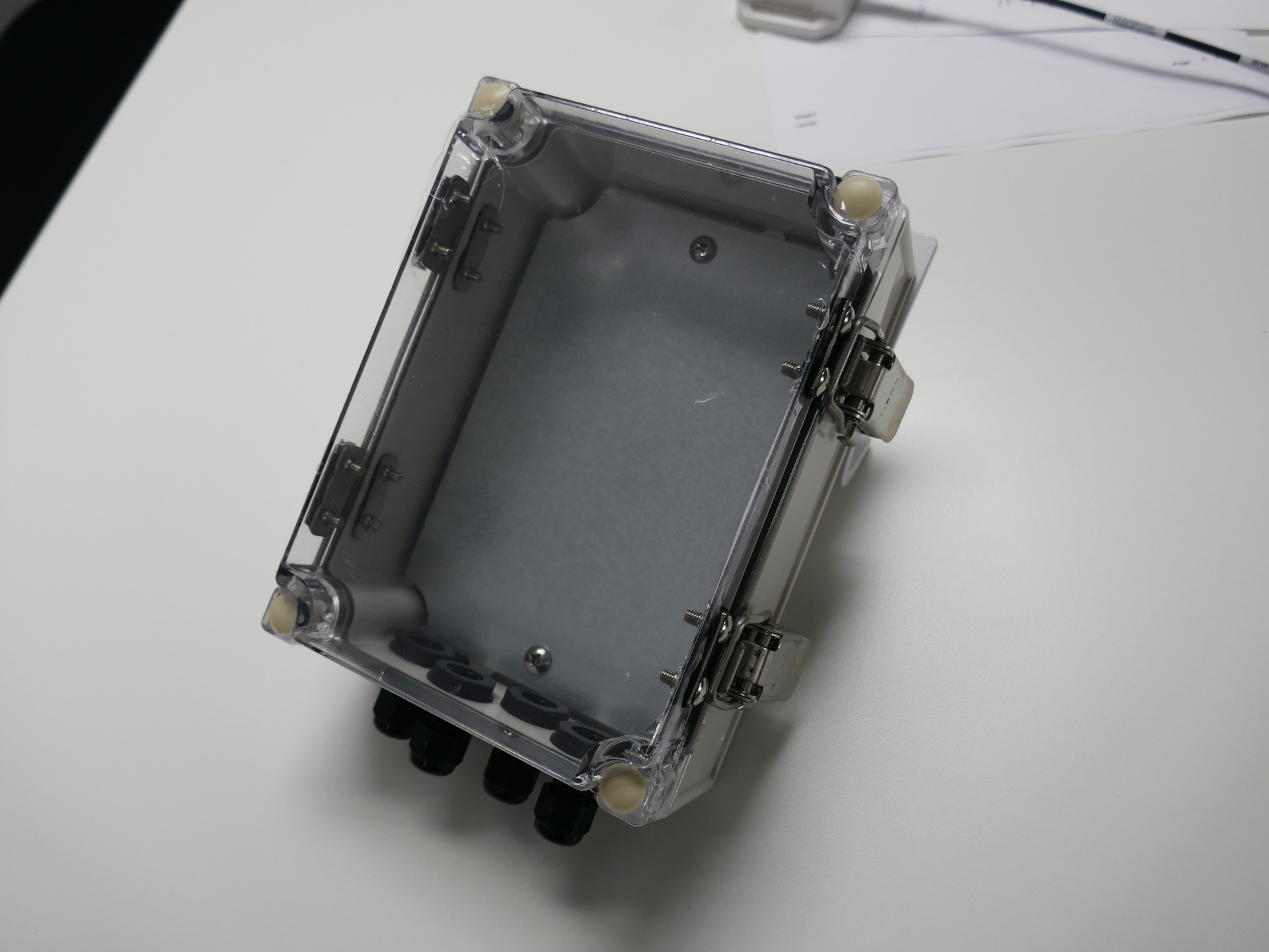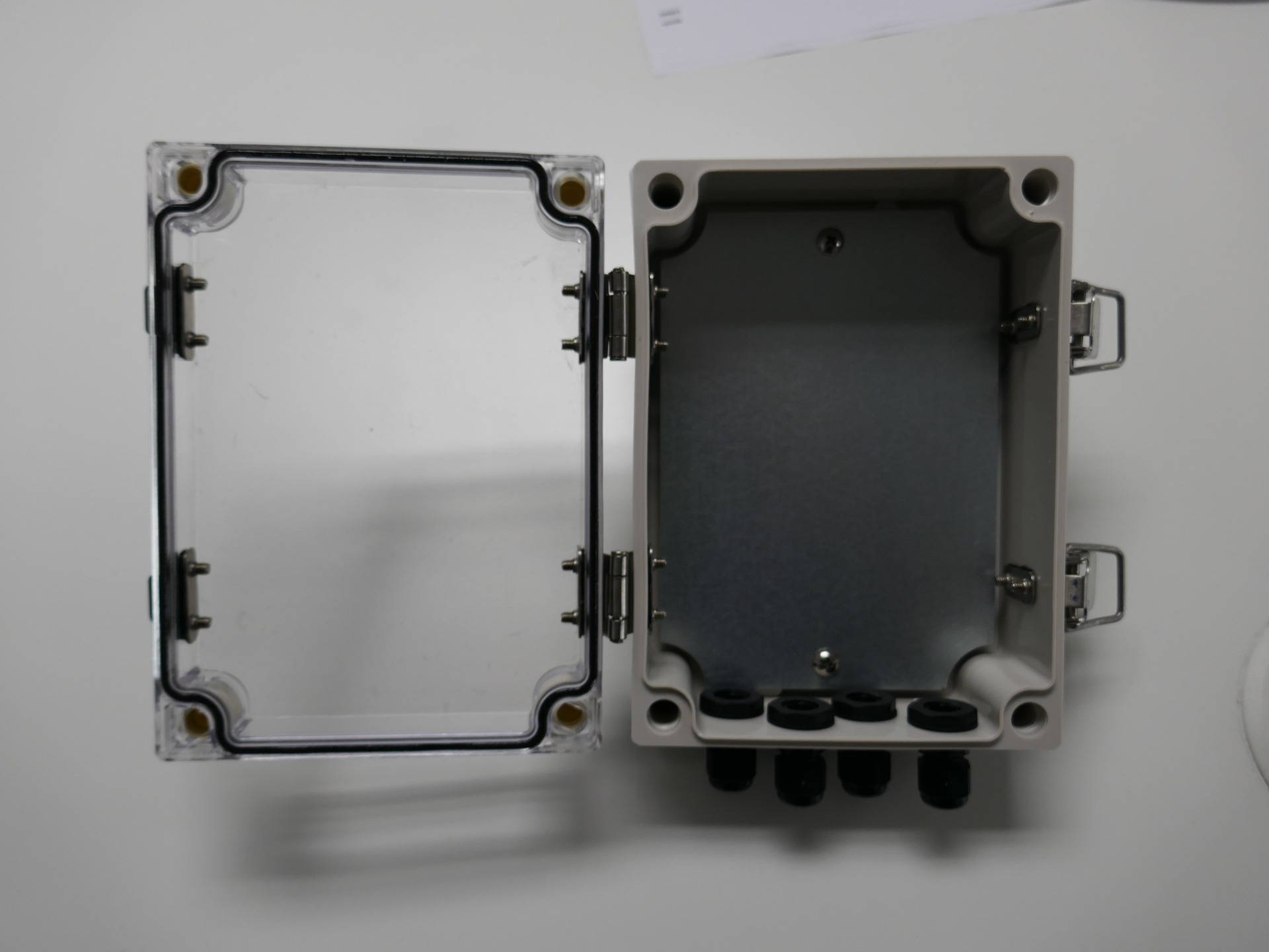Enclosure fitted with 4 x Cable Glands and back hooks for storing long cables, standing box or hooking to framework.